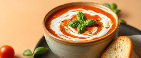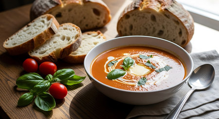 A vibrant bowl of creamy tomato soup, garnished with fresh basil leaves and a swirl of cream, is beautifully presented on a rustic wooden table alongside slices of crusty bread, ripe cherry tomatoes, and additional basil sprigs, all bathed in warm natural light.