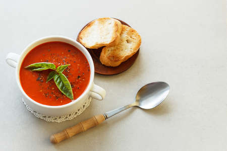 Italian tomato soup with croutons and basil on the table with a spoon.