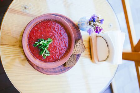 Tomato soup in a plate on a table. Selective focus