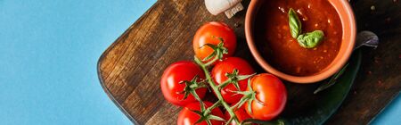 top view of delicious tomato sauce in bowl on wooden board with fresh ripe vegetables on blue background, panoramic shot