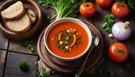 AI Generated. Fresh Tomato Soup in a Wooden Bowl with Rustic Kitchen Ingredients