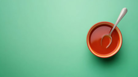 A bright red sauce sits in a bowl with a spoon, placed against a vibrant green background. This minimalistic image highlights culinary creativity and flavor.