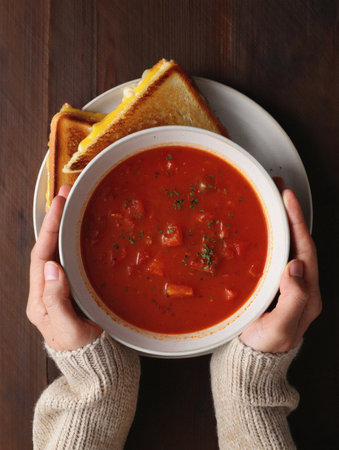Hands Holding Bowl of Warm Tomato Soup and Grilled Cheese Sandwich