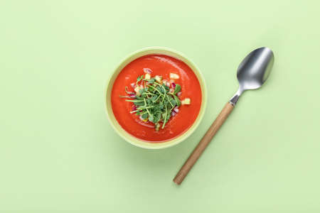 Bowl with tasty gazpacho on color background