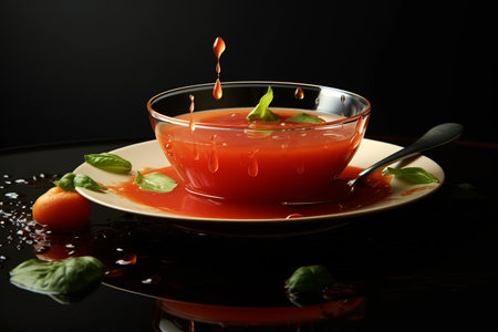Tomato soup with basil in a bowl. AI generated image