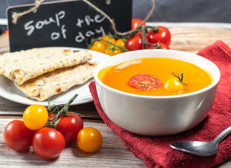 Tomato soup in a bowl on a wooden table. Selective focus.