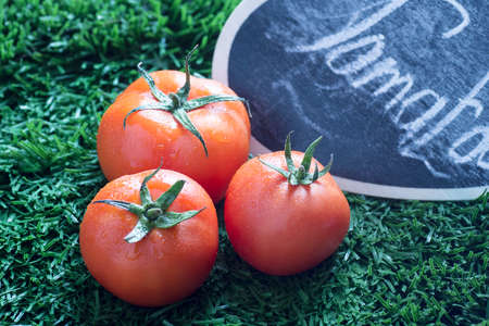 Fresh organic tomatoes on rustic wood background ripe garden, Cooking food concept Italian Copy space leaf one