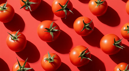 There is a vibrant and colorful pattern of fresh tomatoes displayed beautifully against a clean, crisp white background, enhancing their appeal