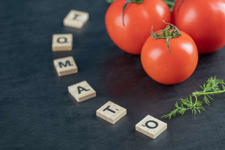 Red Tomato vegitable written on blocks kept in plate on black background space for text
