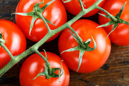 Fresh branch of red tomatoes lies on a wooden table