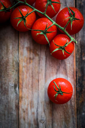 Red fresh cherry tomato branch on wood background