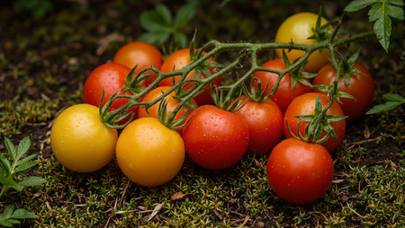 Fresh red and yellow cherry tomatoes on vine dew drops moss background