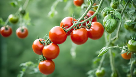 A bunch of ripe red tomatoes hanging from a plant. Concept of abundance and freshness, as the tomatoes are ripe and ready to be picked
