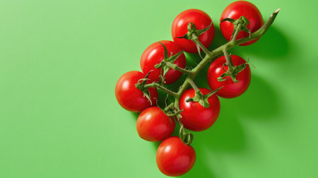 A branch of red tomatoes on a light green background with selective focus and free space left