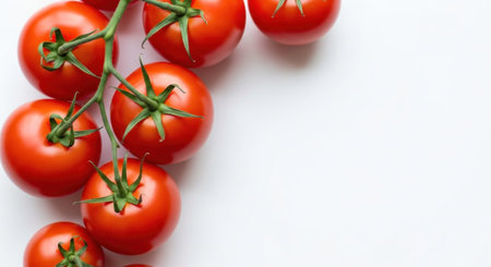 Overhead view of fresh red cherry tomatoes twig by copy space over white background. unaltered, organic food and healthy eating concept.
