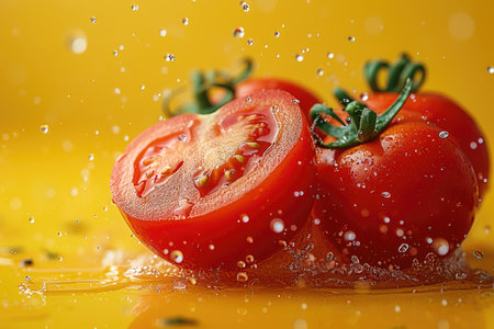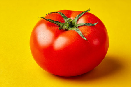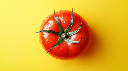 A ripe, glossy tomato bursting with color sits boldly against a cheerful yellow backdrop, evoking freshness and vibrancy perfect for culinary or health-themed projects.