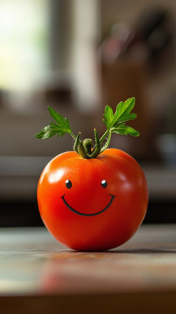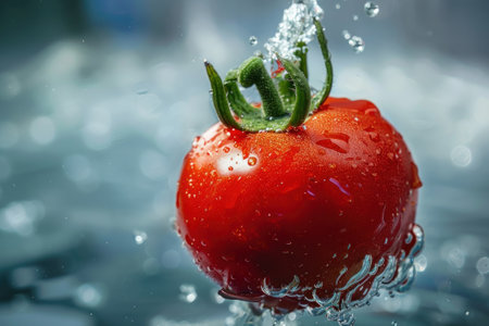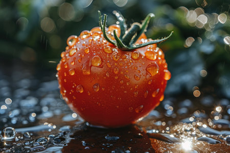 A freshly washed tomato with water droplets clinging to its skin, resting on a kitchen countertop surrounded by fresh vegetables