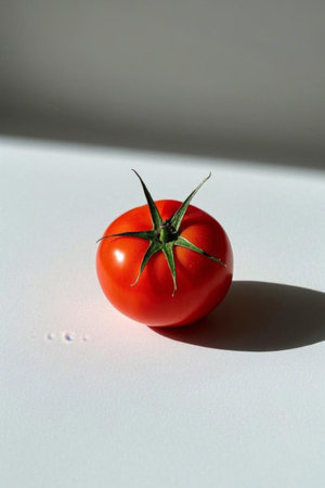 A close-up of a fresh tomato with water droplets, placed on a wooden cutting board with soft sunlight streaming in, highlighting its vibrant red color.