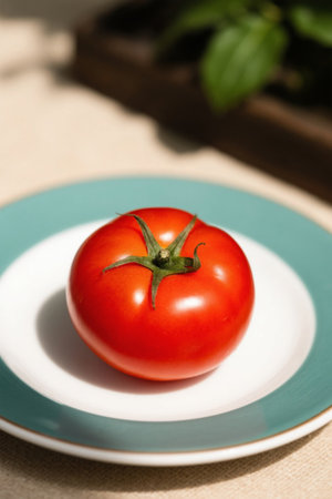Close up front view photo of fresh with flawless ideal skin raw round tomato on round clear flat crockery isolated on white background copy-space copyspace