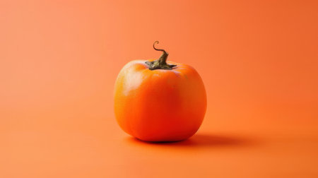 A single, ripe persimmon rests on a vibrant orange background. The persimmon is perfectly centered in the frame, with its smooth, orange skin and delicate stem. The background provides a bold contrast, highlighting the fruit's shape and color.