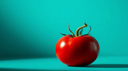 A perfectly ripe, vivid red tomato with a fresh green stem stands out against a captivating teal backdrop, creating a visually stunning, minimalist composition perfect for culinary and healthy lifestyle themes.