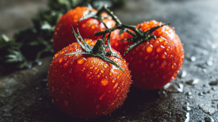 Bright red tomatoes glisten with droplets of water on a dark stone surface, showcasing their freshness. Perfect for culinary visuals, food art, or healthy lifestyle themes.