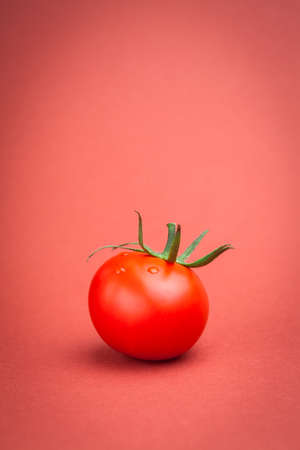 A ripe red tomato on a bright red background. A fresh crop of vegetables.