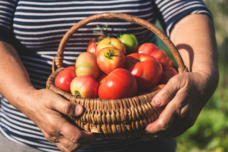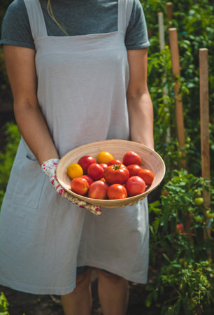 Woman holding fresh tomatoes in the basket. Homegrown tomato harvest in organic garden. Bio vegetables farming concept.