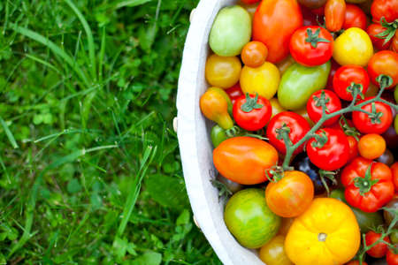 Red and green tomatoes in basket at the garden, outdoor. Summer harvest. Top view