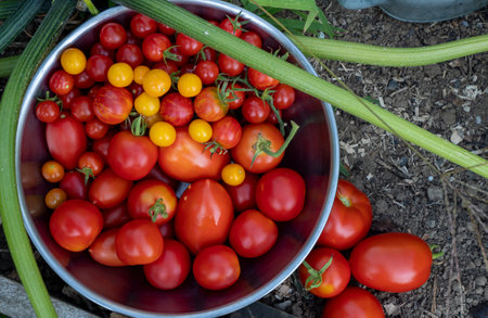 Assorted tomatoes in brown paper bags. Various tomatoes in bowl. Still life of different types of tomatoes. cherry tomatoes being washed in a colandar