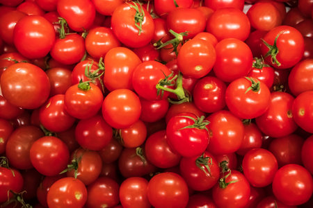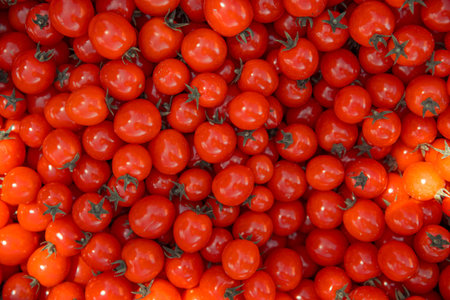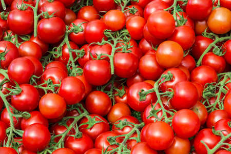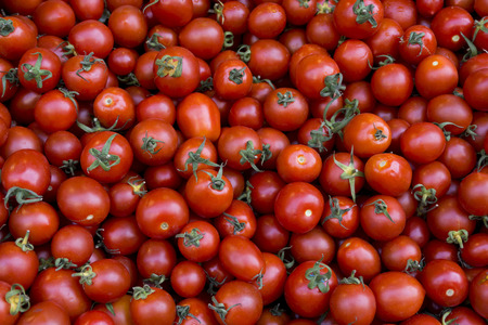 Many small fresh red cherry tomatoes on a counter at a Turkish bazaar, close-up, set of tomatos as a background