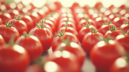 A beautiful display of fresh red tomatoes arranged in perfect rows showcases their vibrant color and healthy appeal, ideal for culinary inspiration and farm-to-table concepts.