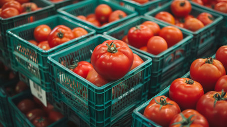 Fresh red tomatoes displayed in green crates at a market, showcasing a vibrant and healthy produce selection.