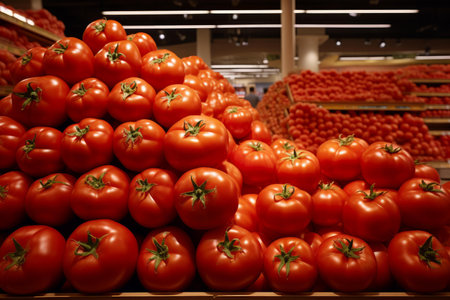 Supermarket filled with red tomatoes. Tomatoes are arranged in cluster. Light catches surface of tomatoes, highlighting vibrant color and glistening texture. They were recently harvested. AI generate.