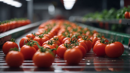 AI Generated. Closeup fresh raw tomatoes on the conveyor belt
