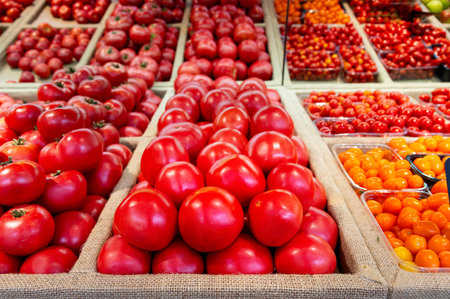 Stall with tomatoes in a grocery store
