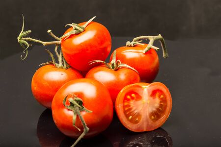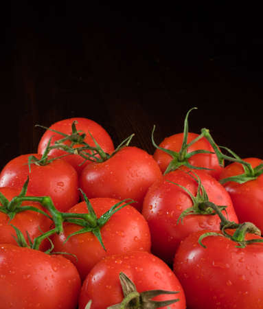 Fresh organic tomatoes, picked from the garden, on dark background. Selective focus.