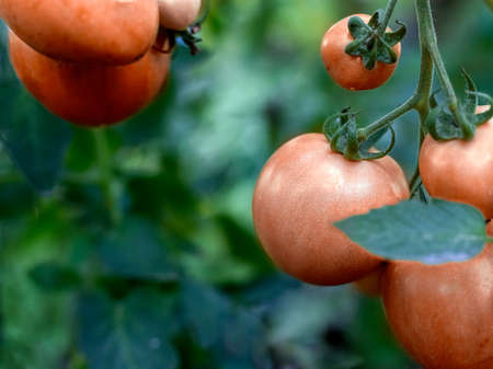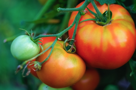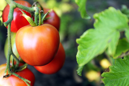 Delicious fresh tomatoes growing in a garden closeup. Shallow depth of field. Selective focus.