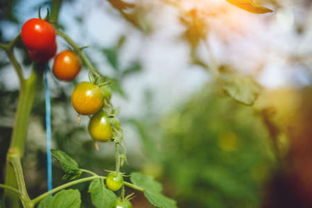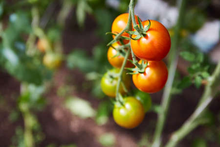 Beautiful view of red cherry tomatoes in a greenhouse in the countryside. Soft morning lighting without harsh shadows.