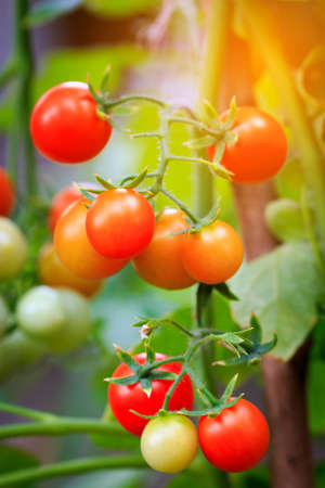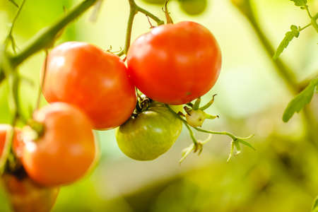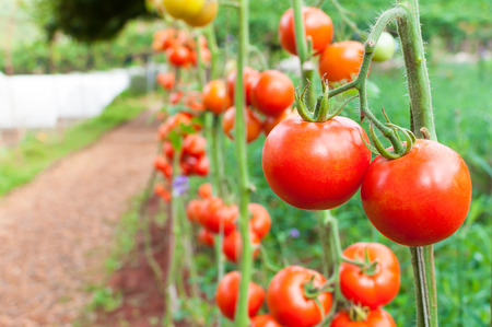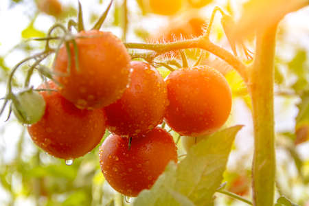 Fresh red ripe tomatoes plant hanging on the vine growth in organic garden ready to harvest