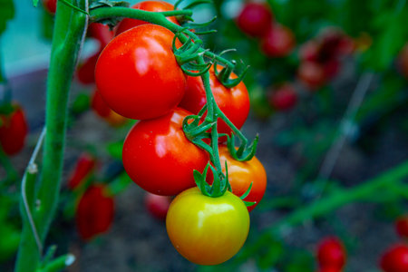 Ripe organic tomatoes on a branch in a greenhouse. Shallow depth of field