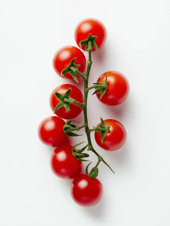 Cherry tomatoes branch isolated on white background. Red tomato. Tomatoes on a branch. Isolated background. Article about vegetables. Decoration. Copy space. Studio photo of vegetables