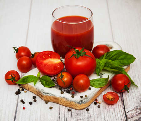 Fresh tomato juice with whole vegetables iagainst wooden background