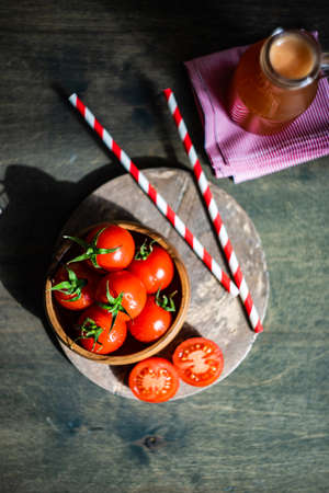 Organic tomatoes juice in a bottle with straw and fresh cherry tomatoes and parsley herb on dark wooden table