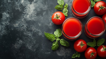 Glasses of tomato juice, tomatoes and basil leaves on a dark background, top view with space for text, created with Generative AI technology