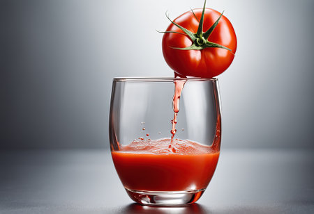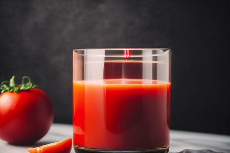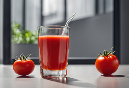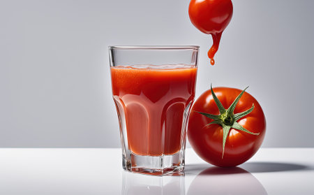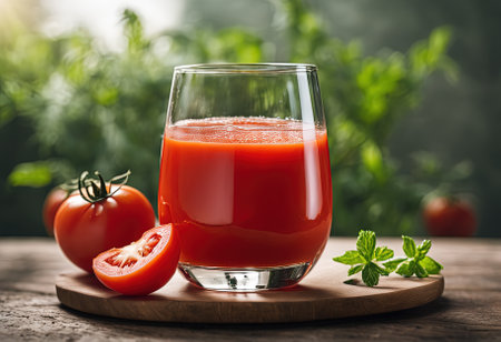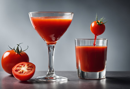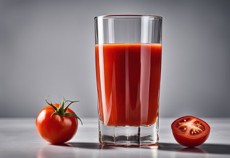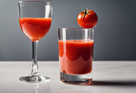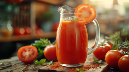 healthy concept with a pitcher of freshly squeezed tomato juice garnished with a tomato slice, ready to enjoy in a clear glass