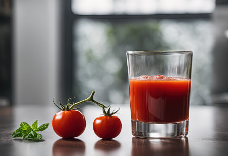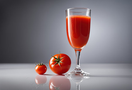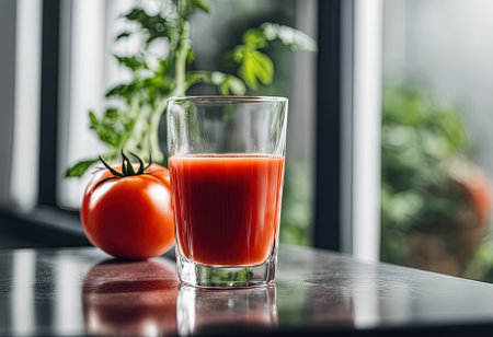 Vibrant glass of tomato juice alongside a ripe tomato on a reflective black surface