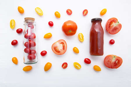 Tomatoes juice in bottle and fresh tomatoes on white wooden background.