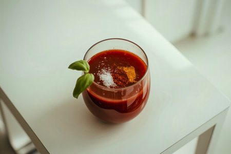Tasty tomato juice with fresh spices, garlic, pepper and basil