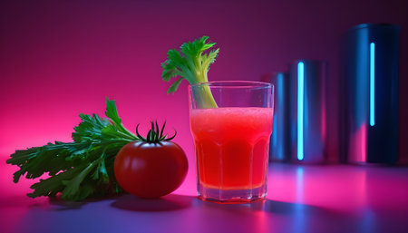 Glass with tomato juice and tomatoes on a dark lilic background with space for text, created with Generative AI technology